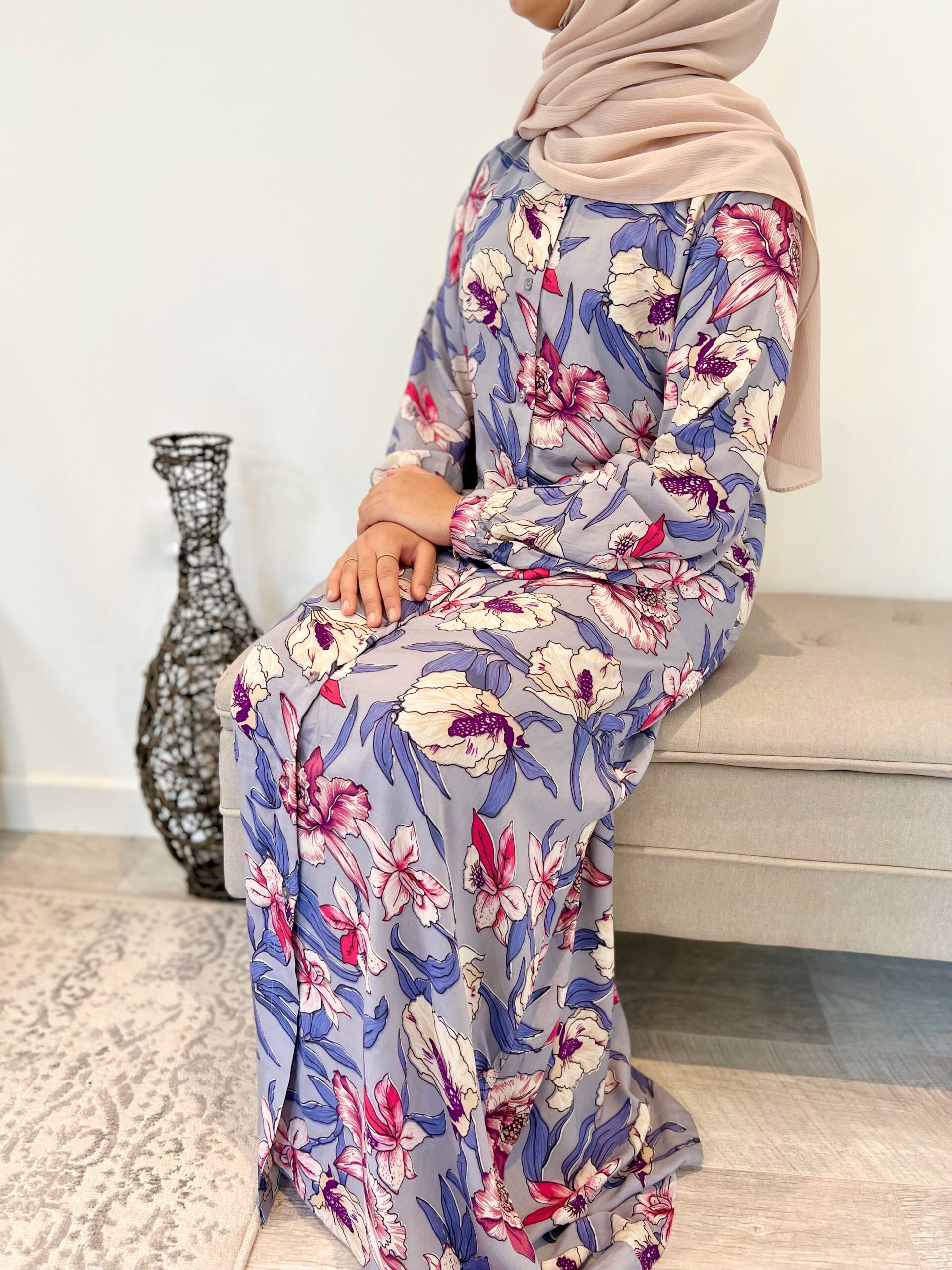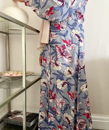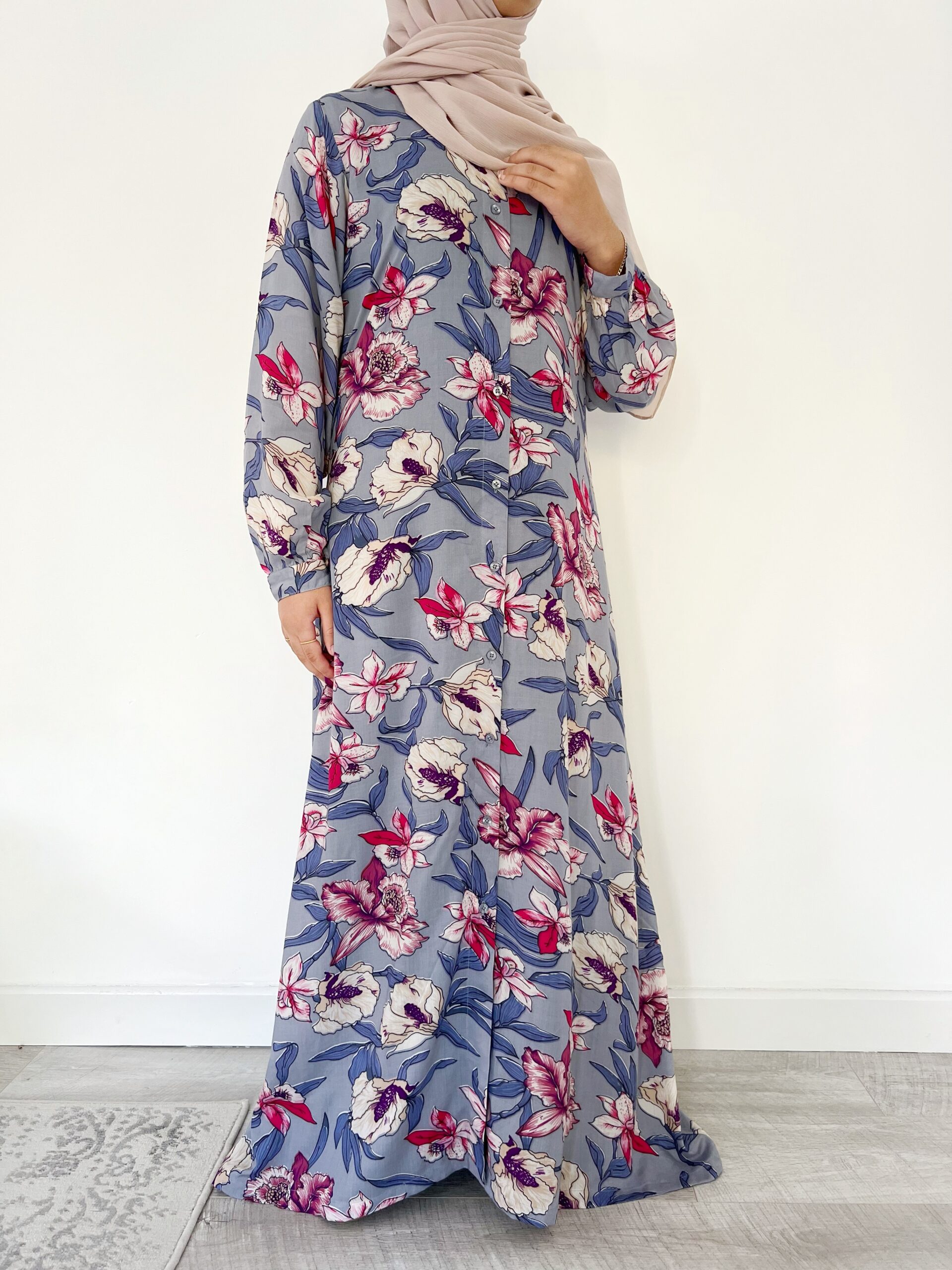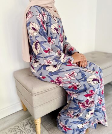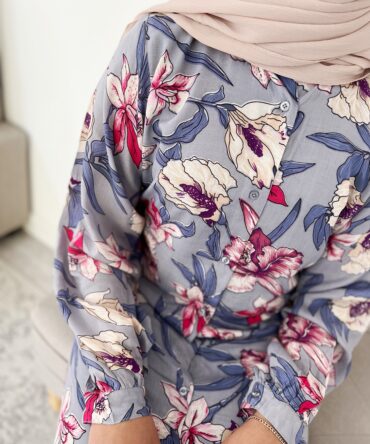 MAHEEN – A Classic Floral print Shirt dress with a long lantern cuff sleeve design that encompasses the ideology of simple sophistication. An elegant Silhouette, that is flattering on most body shapes given the modest yet feminine A-line tailoring. The buttoned shirt dress can we worn both open or closed. Sleeve design allows the Maheen Abaya to be both sophisticated yet versatile as it can be dressed up or down depending on the occasion.
