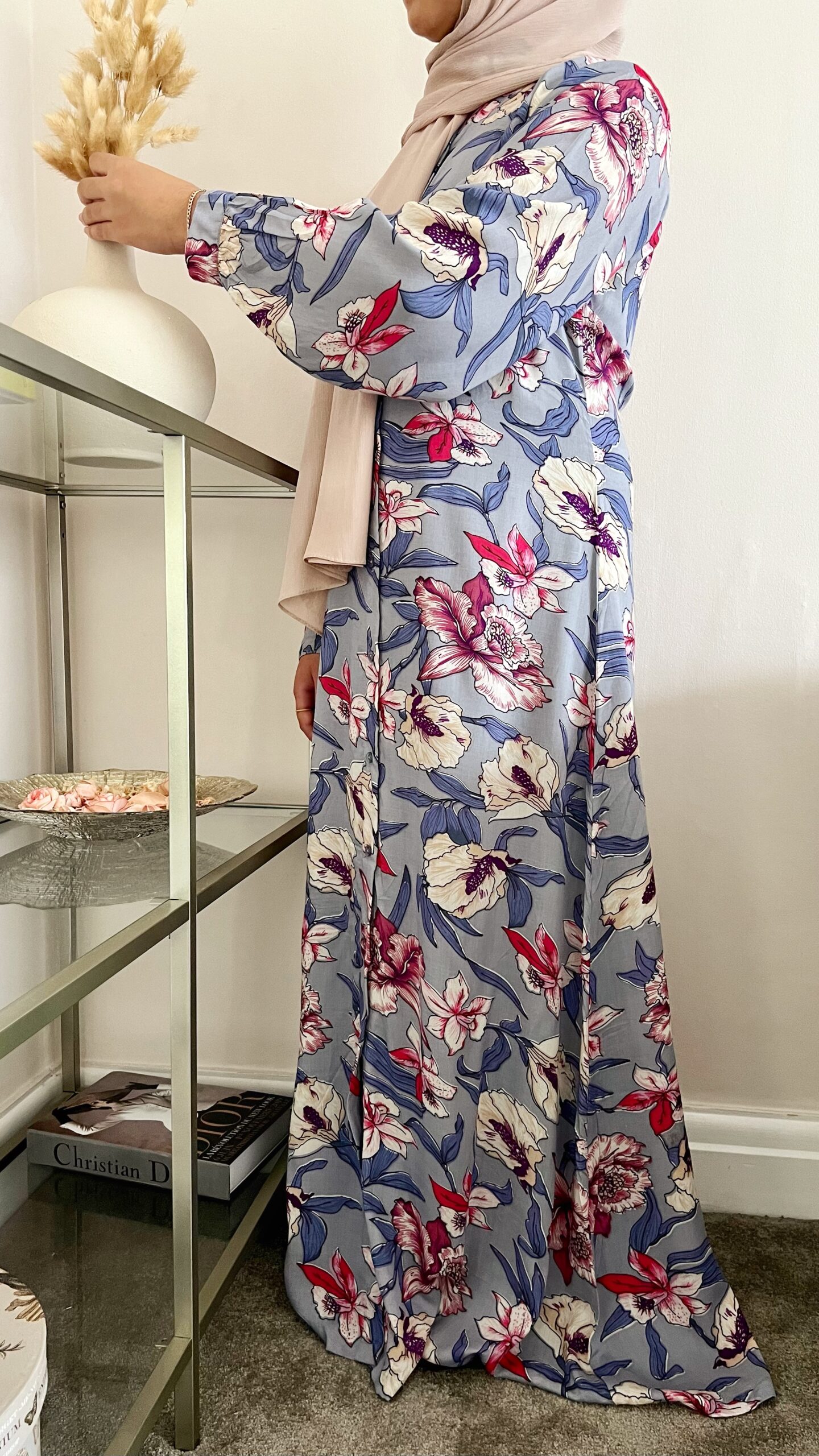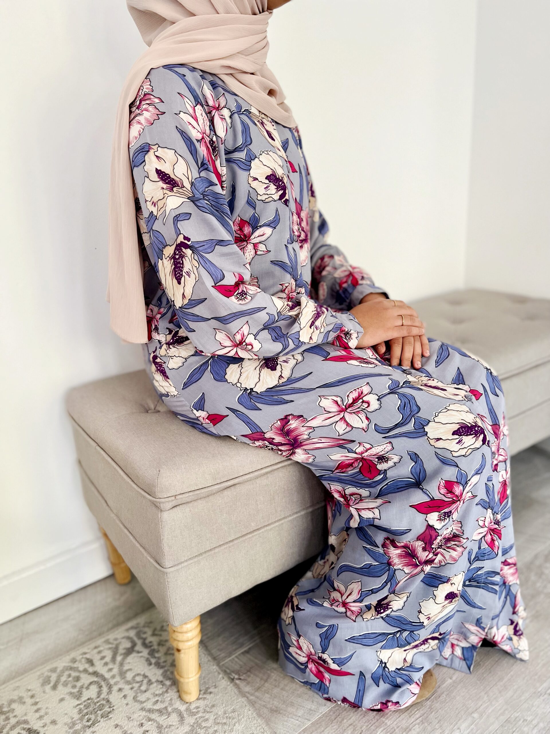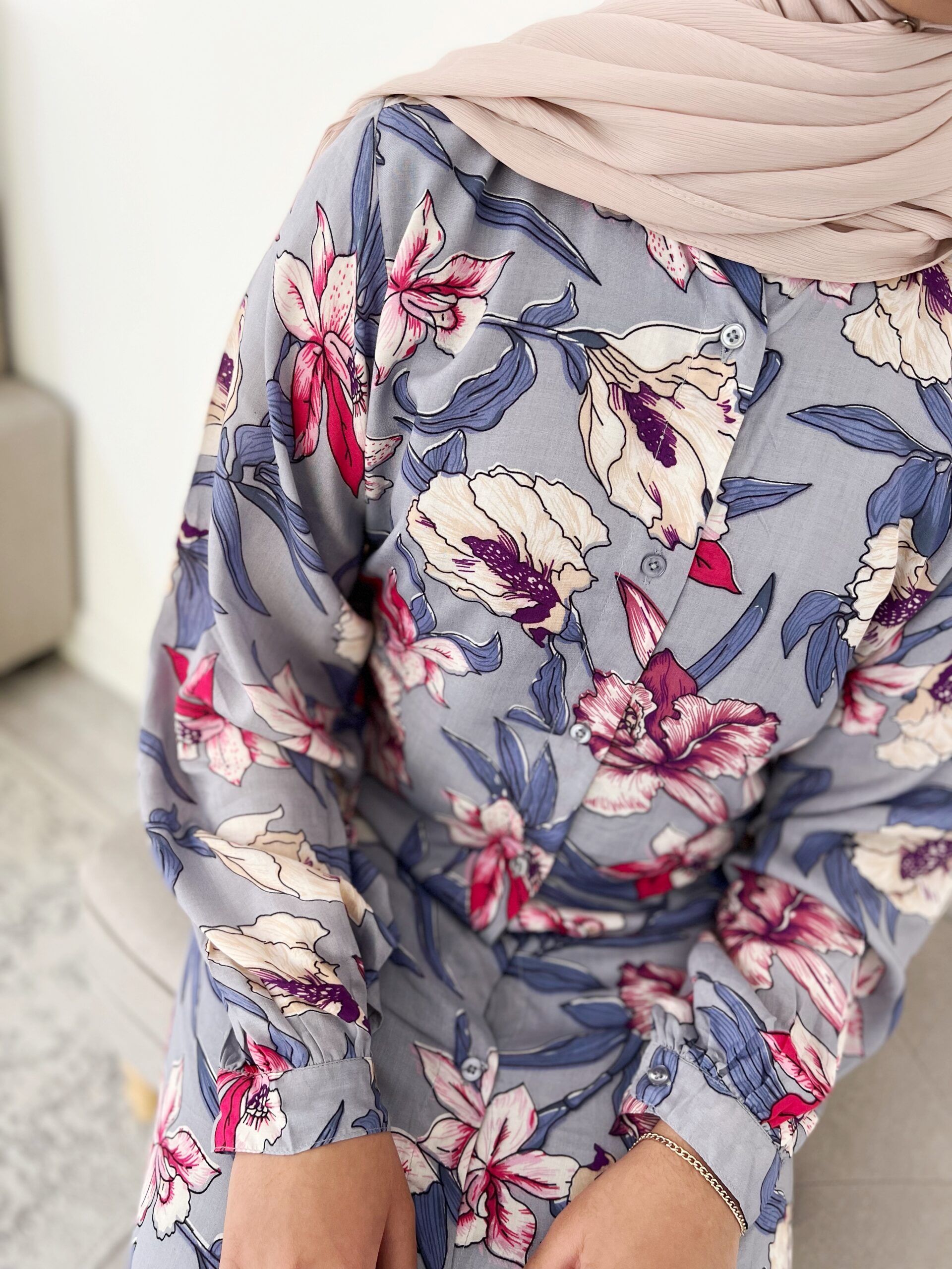 MAHEEN – A Classic Floral print Shirt dress with a long lantern cuff sleeve design that encompasses the ideology of simple sophistication. An elegant Silhouette, that is flattering on most body shapes given the modest yet feminine A-line tailoring. The buttoned shirt dress can we worn both open or closed. Sleeve design allows the Maheen Abaya to be both sophisticated yet versatile as it can be dressed up or down depending on the occasion.