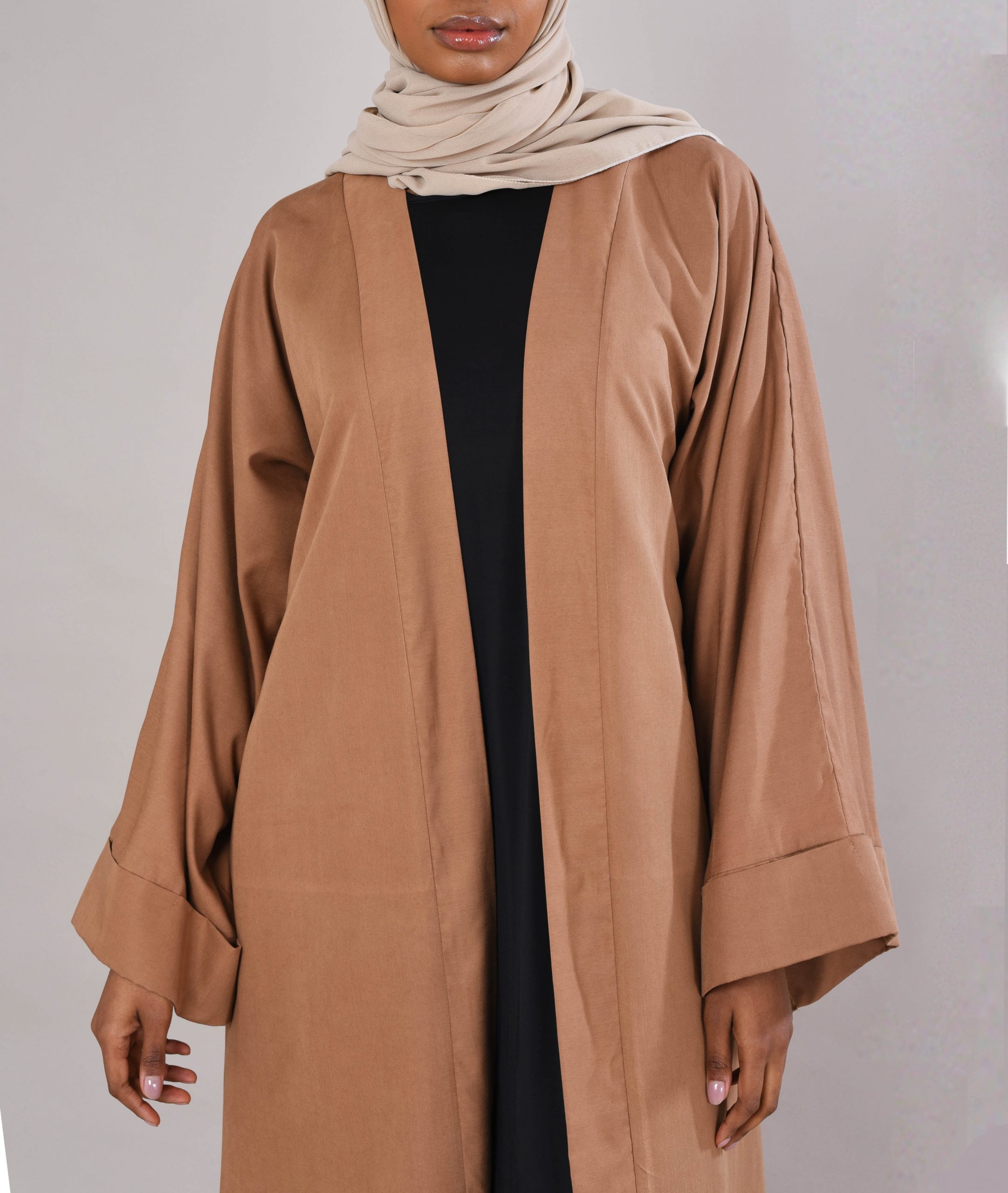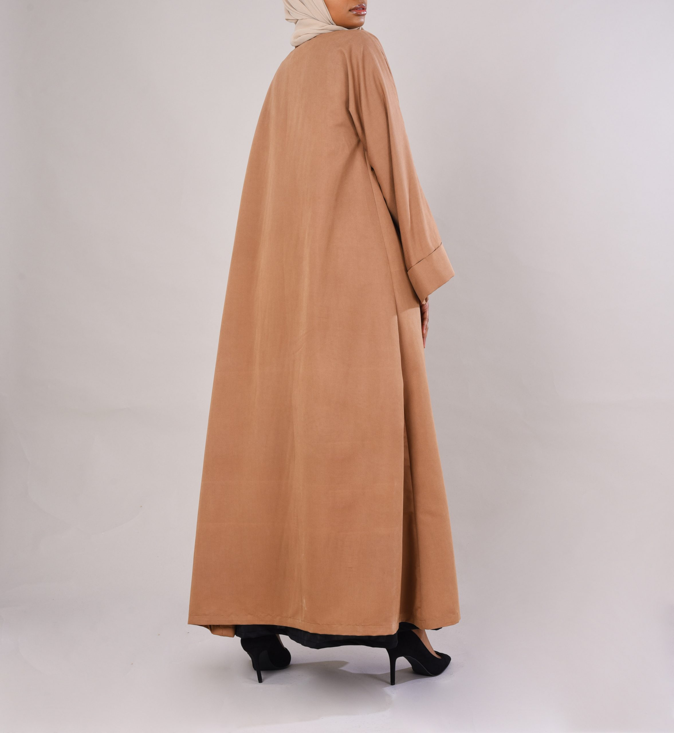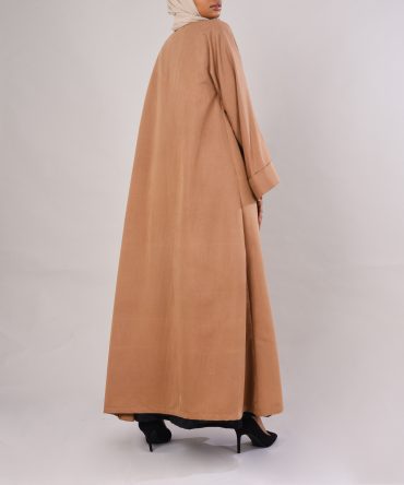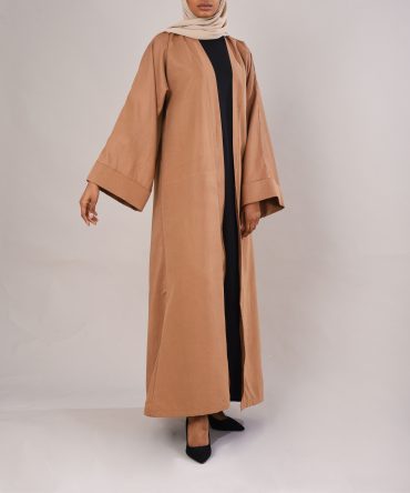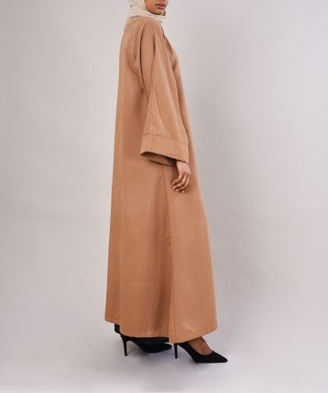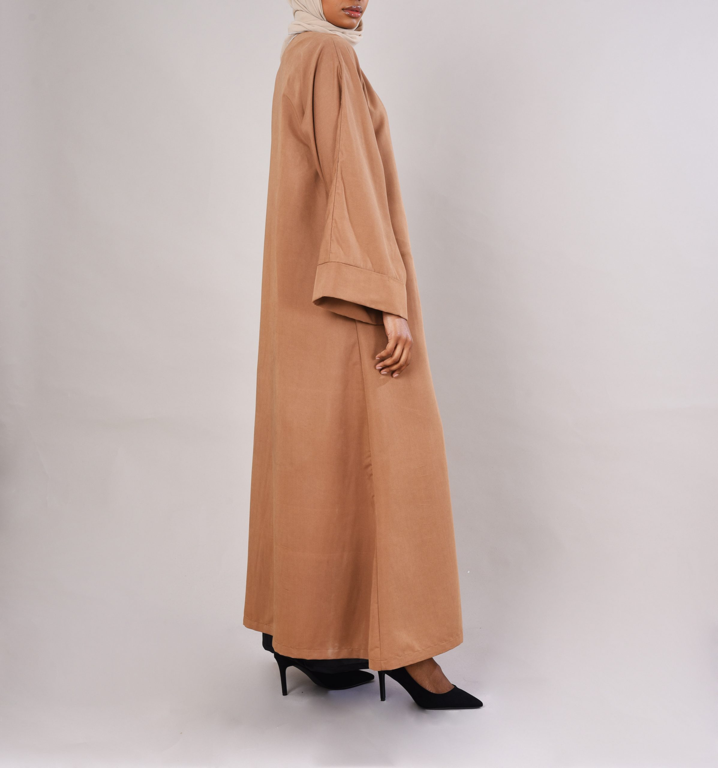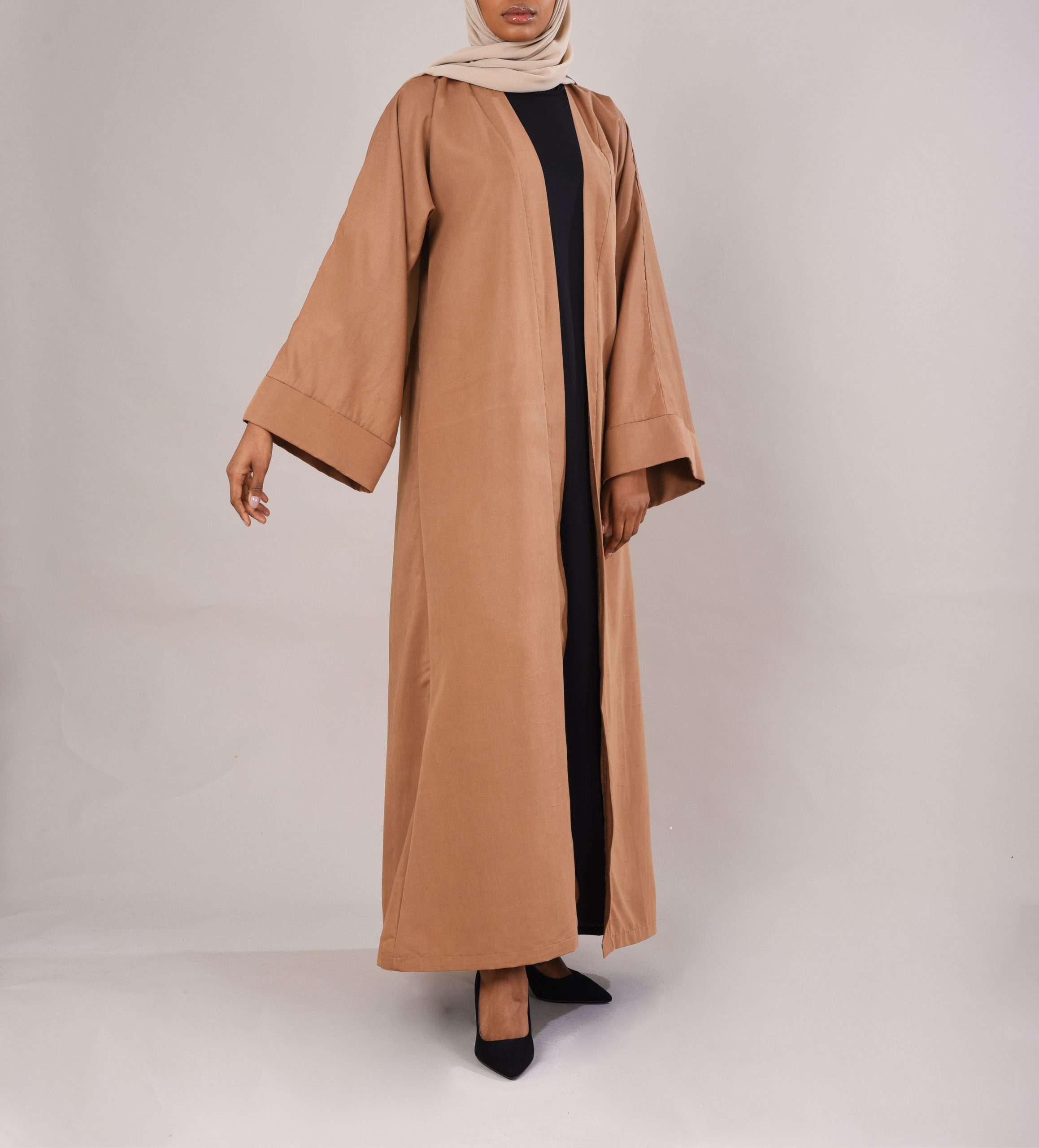 RUHI – This Caramel Abaya is a Classic Robe Abaya in a soft cotton fabric, the front open Abaya can be styled with jeans or dressed up for the evening, Sourced for its softness and warm tone this piece is a great throw over and can be worn all through the Year.